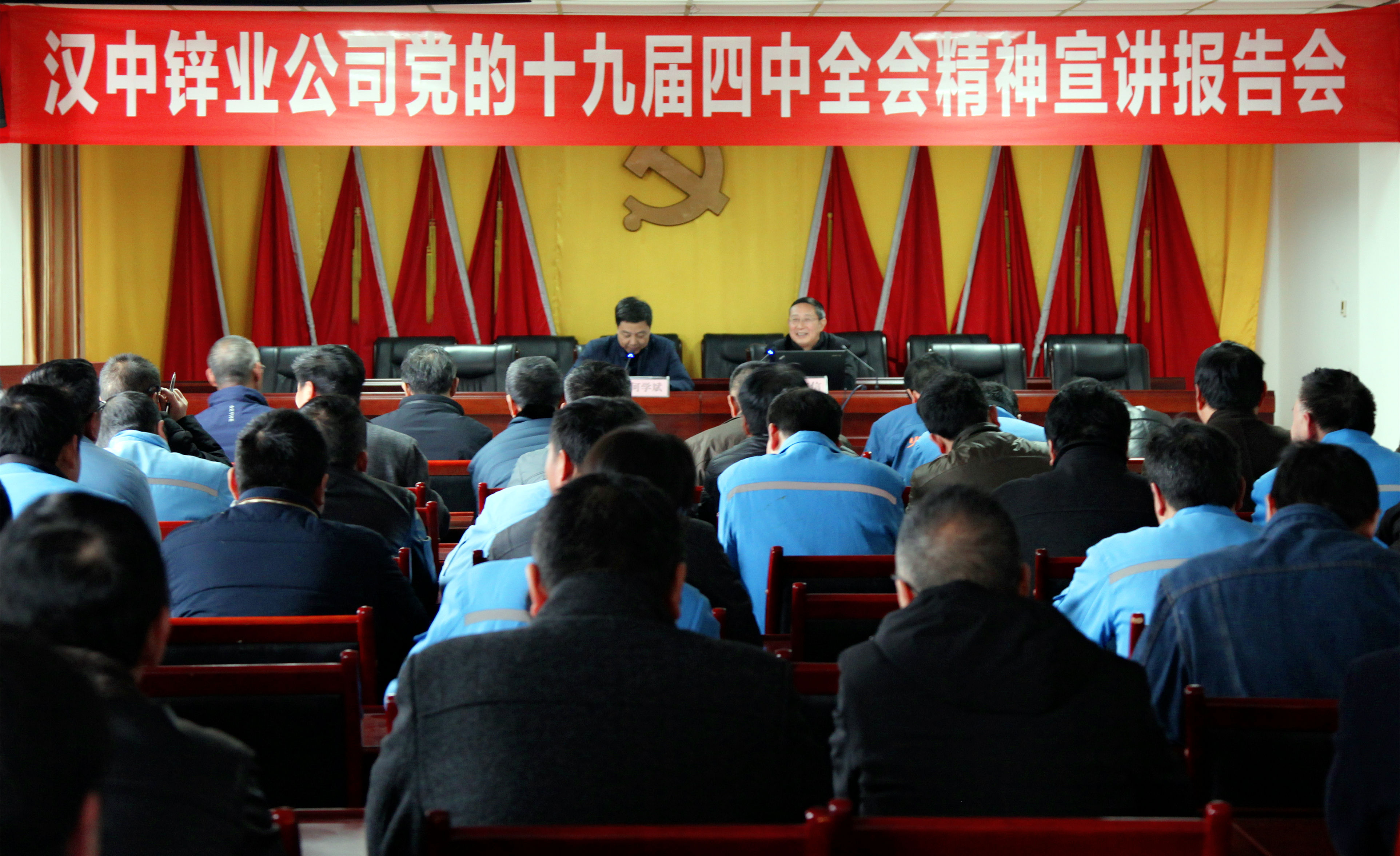 12月19日上午,集團(tuán)公司黨的十九屆四中全會宣講團(tuán)成員、陜西煎茶嶺鎳業(yè)公司黨委書記楊宏信,到漢中鋅業(yè)為廣大黨員、干部宣講黨的十九屆四中全會精神,宣講報告會由漢中鋅業(yè)公司黨委書記、董事長何學(xué)斌主持。